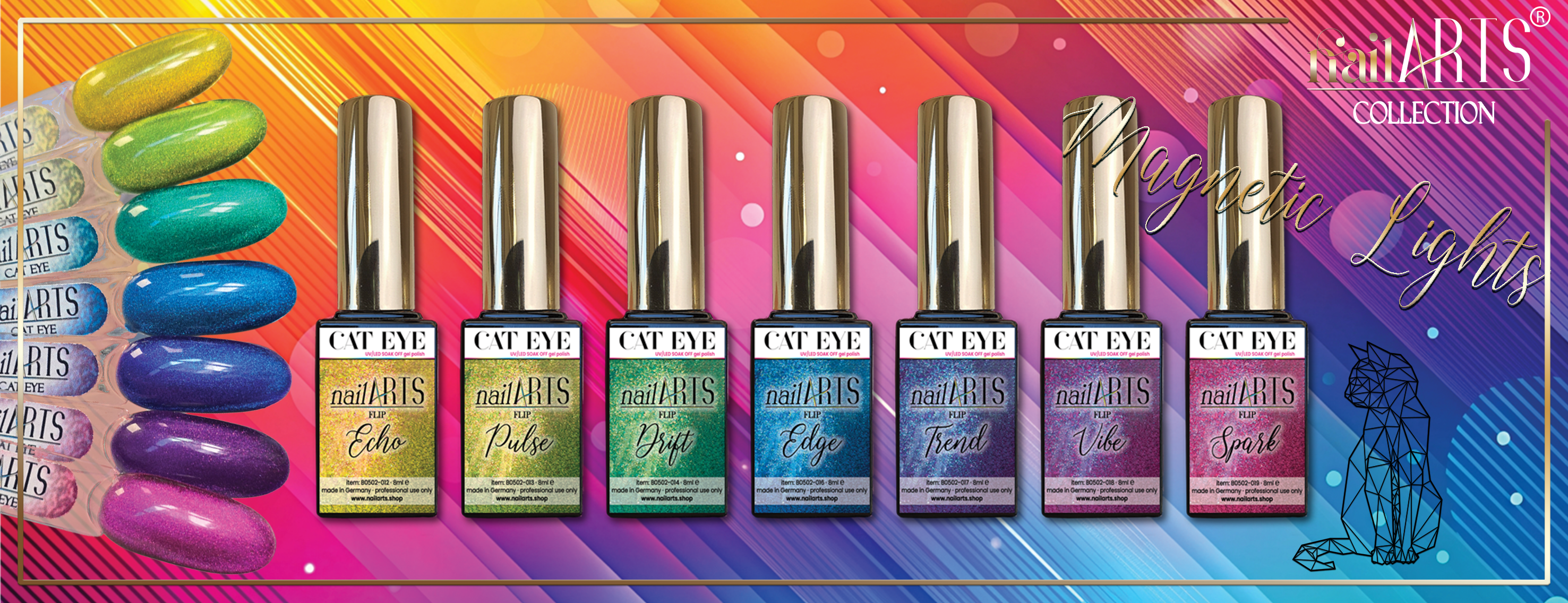 Wunderschön funkelnder magnetischer Cat Eye Gellack - transparent in kräftigem Ton mit Chamäleon Effekt, der in mehreren Farben, je nach Licht, changiert - natürlich in umwerfender nailARTS Optik, inkl. Color Stick